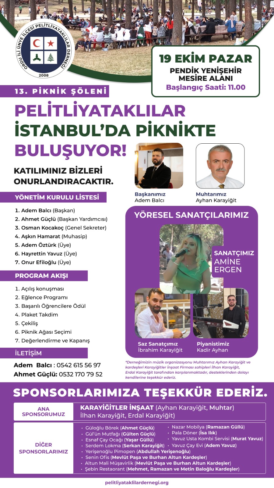 Dernek Yonetim Kurulu olarak havanın yağmurlu olması nedeniyle 2025 Genel Piknik organizasyonunu iptal etmek zorunda kaldık, siz değerli hemşerilerimize ve misafirlerimize mahcupbiyetimizi dile getirmek adına krizi fırsata cevirerek Genel Kahvaltu Programı organize ettik.